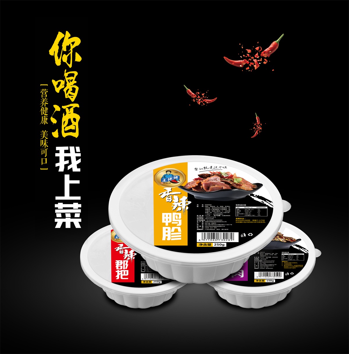 土姥姥,主打凉菜和调味料两大系列,本方项目前期通过仔细调研,主打市场目标为KTV,夜总会,门店,超市,酒店,线上等;主要销费群体为年轻一族,或其它在口味上有所突破,尝试新鲜食材的消费者, 所以在在策划和设计上,主走简约明快,时尚个性的风格,对色,香,味作深层挖掘,呈现土姥姥产品放心,健康,美味,多样的产品优势。